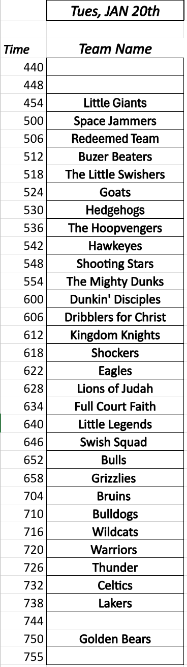 Season after season things change slightly for us at Shepherd Sports depending on how many athletes sign up and the needs of the gym space for church wide activities. The following is what we have planned for our Winter Season but could potentially change slightly. Most of our sessions take place in the Shepherd Gym but there is a chance others gyms could be used if needed.  Winter league will be a 7 game season with 6-7 practices.